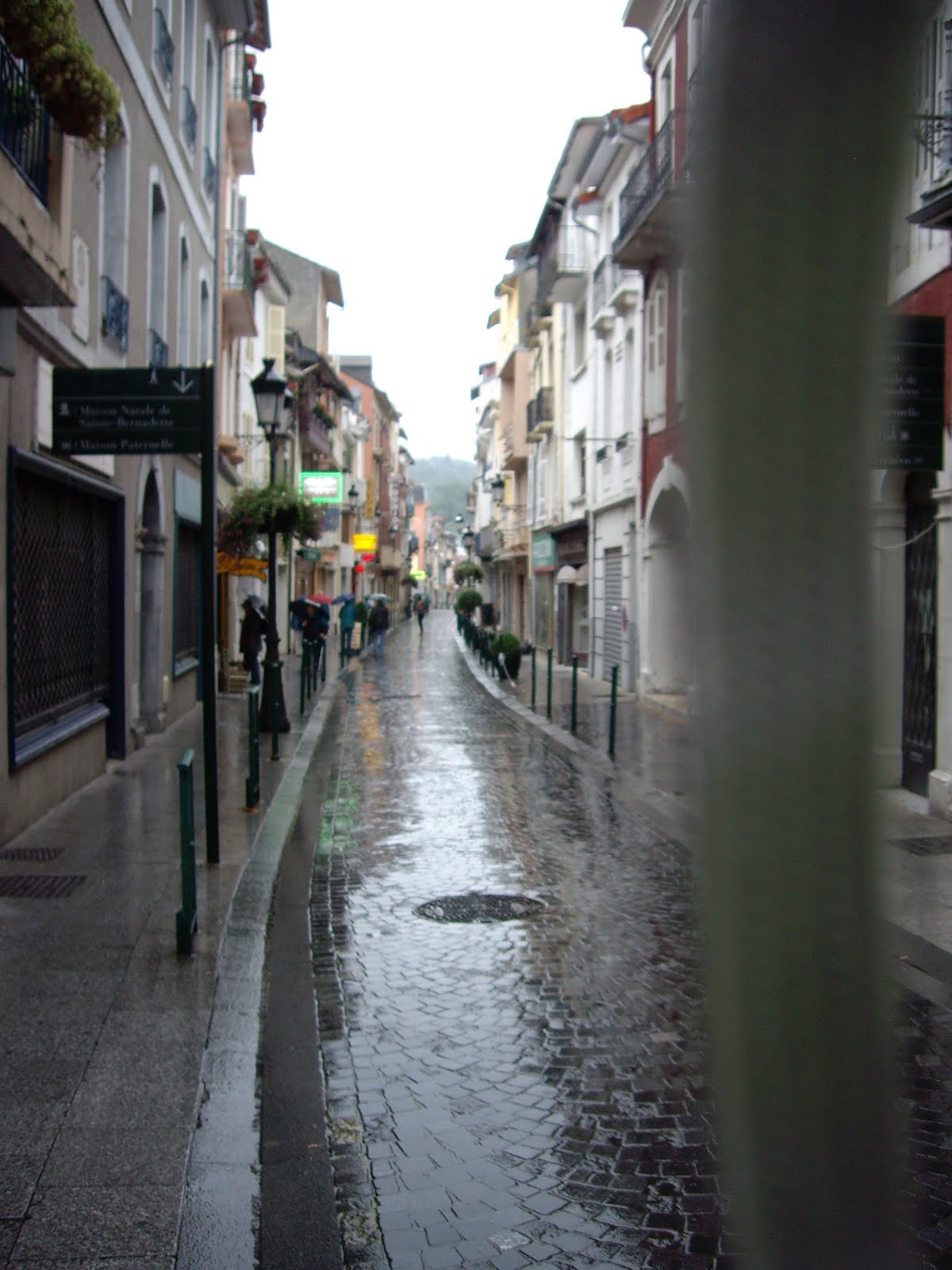 Woke up Wednesday the 21st to a rainy drizzly day in Lourdes. Having done the Tourmalet the day before I decided that today would be a good day for shopping and exploring Lourdes. After breakfast a group decided to walk to the local bike shop. The direct route would be about 2k-3k but some took an undetermined long route and wound up with about 6k through some of the less scenic residential areas. I had the concierge draw me a map and point me in the right direction and we intersected our wayward friends along the way. The bike shop was Hubert Abares Cycles. It was a really nice shop that carried better cycling goods and numerous brands of high end bikes. Don was on a mission to buy a floor pump since the two we had were not in good shape and inadequate for our whole group. I wanted to find a local bike kit (cycling outfit) that you couldn't find on line or anywhere else. As luck would have it we arrived at the shop just before the big rush and I was able to find a really cool kit. The lady that helped me pointed out that Tourmalet was misspelled on the back (left out the T) and that she would give me 30% off. Besides being very friendly and helpful, the French people I encountered were also very honest. I wound up buying the kit for probably less than a nice one in the states would cost so I was very pleased. Now I had my souvenirs, a Tourmalet jersey that you can only get at the top of the Tourmalet and the local French bike shop kit. Don was successful in getting what we determined to be the last bike floor pump in all of southwest France. After paying for our goods we walked back to our hotel while a standing room only crowd waited outside for their turn to enter the store. Funny thing about the French, good or bad they do not seem to be so hung up on the money side of things. Despite the hoards of people waiting to enter the shop and a sure fire windfall of sales, the shop would be closed the next two days during the TDF. I found out after we left that Hubert Abares was a Tour stage winner probably back in the late 80's and he was actually at the shop. I guess I could have gotten him to sign it, but oh well. My shopping was not finished for the day. I had not been in contact with anyone, family, friends or office since the Friday afternoon of my departure and thought it best that I invest in a cheap GSM phone and make a few calls. I found the French version of a Verison/ATT store called Orange and purchased a phone. Had I known what I do now, I would have asked ATT to unlock my Blackberry and just bought a phone card there. The phone came with 10 minutes of prepaid talk time which I used up in short order for a call to the office and a couple texts to my kids. I would purchase another phone card to add minutes but found out after a frustrating couple of days, it was only good with landlines. Other activities this wet Wednesday included lunch with Don (Atl Cycling owner) and Tom (our tour guide). Don has been riding for 30+ years and Tom who is 68 still races in England. There were a lot of good stories, cycling lore and a wealth of information about bike stuff I never knew. We talked about riding to the Hautacom, a remote mountain climb where Lance Armstrong as a new Tour rider first got national attention as a potential Tour contender back in the early 90's. Tom and I wanted to ride it but Don did not want to with it so wet and after a beer or two at lunch we let it slide. Today was a rest day for the Tour riders and some of our group had ridden to Pau to check out the team hotels and local scenery. We would take the bus there in the morning to see the start. It would be the second climb up the Tourmalet and the last and decisive mountain stage. Andy Schleck would have to put some time between he and Contador if he was going to have any chance of winning the Tour de France. Friday would be a flat stage that would be for the sprinters and probably not affect the overall general classification riders. Saturday would be the 57K individual time trial (rider against the clock) that would be the last chance for a change. The final stage to Paris and the ensuing criterium (race around the Champs Elysee) would only decide the green jersey winner for the sprinters. It is Tour de France cycling custom for the final ride into Paris to be more of a processional for the GC winner, sipping champagne and riding at a very slow parade like pace. The Tour purposely had the riders take the TGV train (bullet train) from the end of the time trial stage in Pauliac to the outskirts of Paris to shorten the overall ride. I decided to go out with a few others for dinner and then head back to the hotel to hang out with others. See you in the morning.